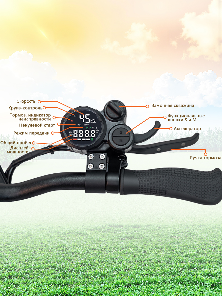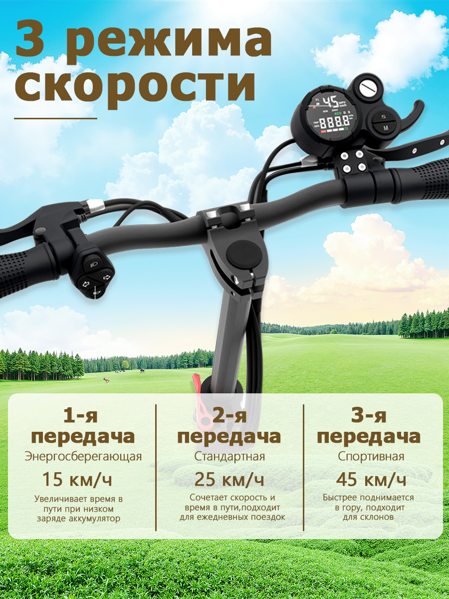 Время полной зарядки аккумулятора составляет 10 часов, что удобно для восстановления энергии в ночное время. Преодолеваемый угол наклона достигает 20 градусов, позволяя уверенно подниматься на мосты, эстакады и другие возвышенности. Информативный дисплей отображает скорость, уровень заряда и другие важные параметры поездки.