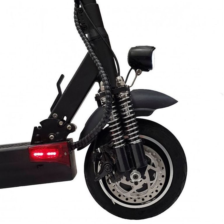 - Электрический складной самокат Joyor Y10S имеет передний и задний дисковый тормоз, а так же усовершенствованную двойную переднюю подвеску.