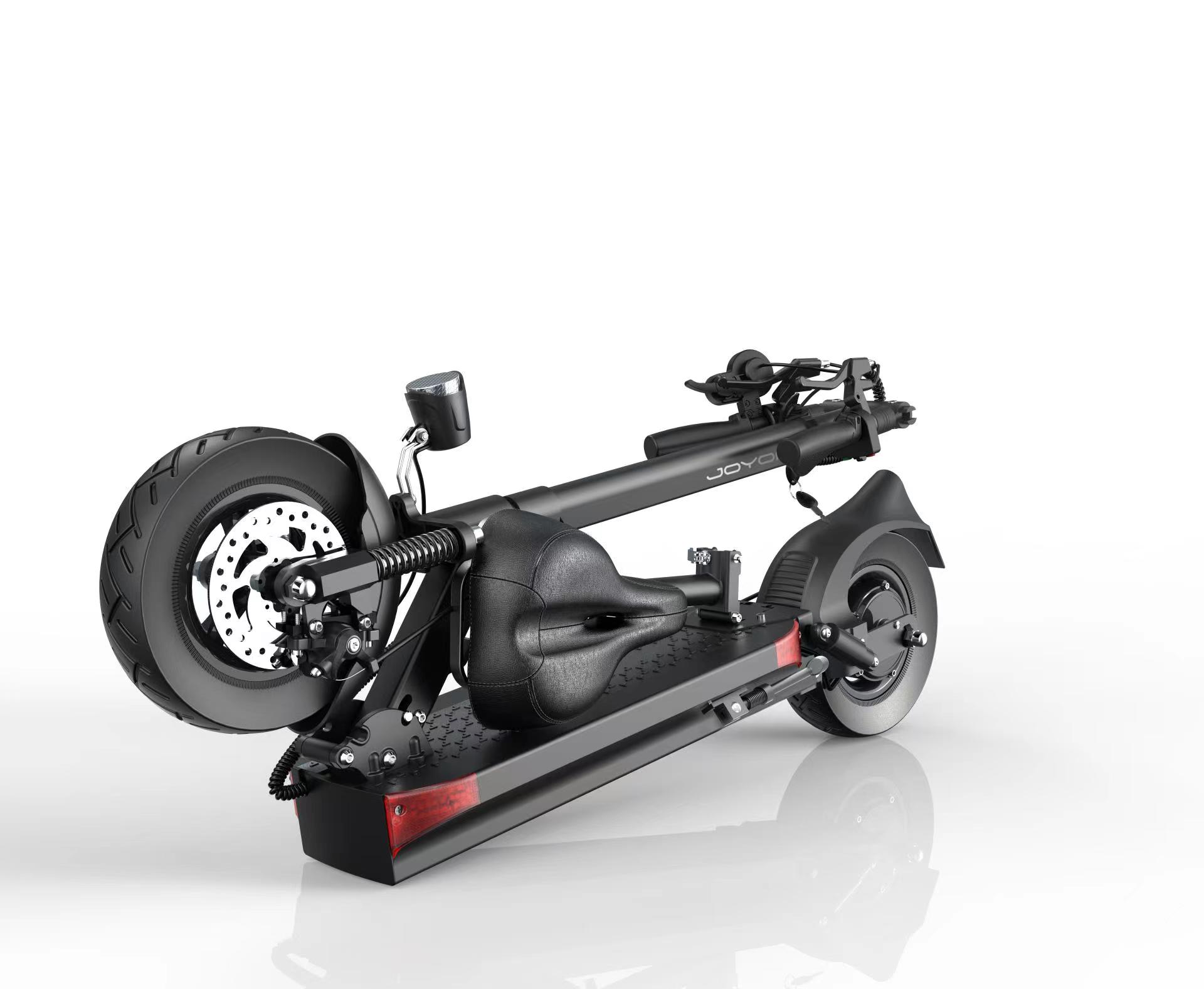 - Для максимального комфорта во время поездки к электросамокату Джоер Y5S можно прикрепить мягкое сиденье, оснащенное амортизаторами и регулируемое по высоте.
